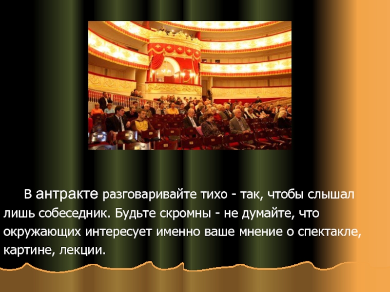 Слайд 13 В антракте разговаривайте тихо - так, чтобы слышал