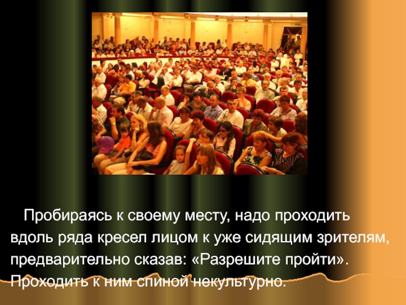 Пробираясь к своему месту, надо проходитьвдоль ряда кресел лицом к уже сидящим зрителям,предварительно сказав: «Разрешите