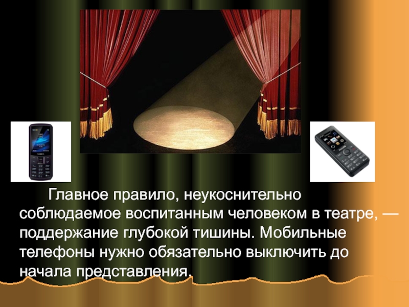 в театре, — поддержание глубокой тишины. Мобильные телефоны нужно обязательно выключить до начала представления.