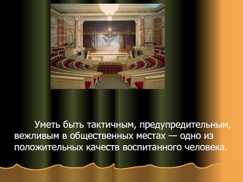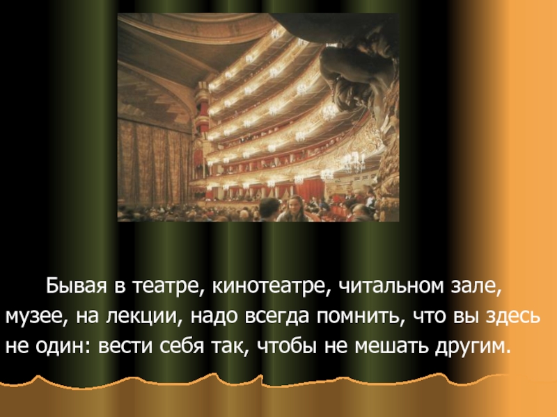 Бывая в театре, кинотеатре, читальном зале,музее, на лекции, надо всегда помнить, что вы здесьне