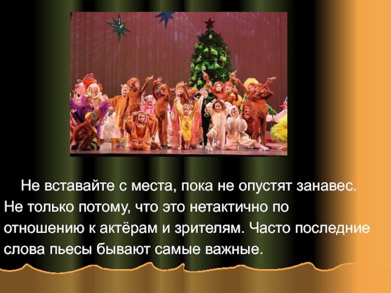 Слайд 14 Не вставайте с места, пока не опустят занавес.