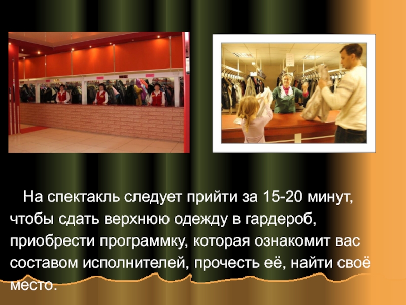 Слайд 5 На спектакль следует прийти за 15-20 минут,