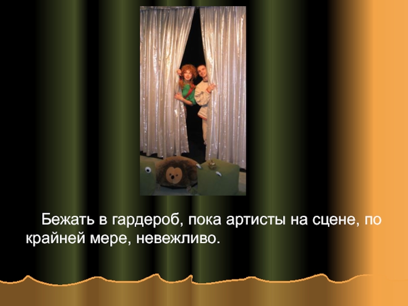 Слайд 15 Бежать в гардероб, пока артисты на сцене,