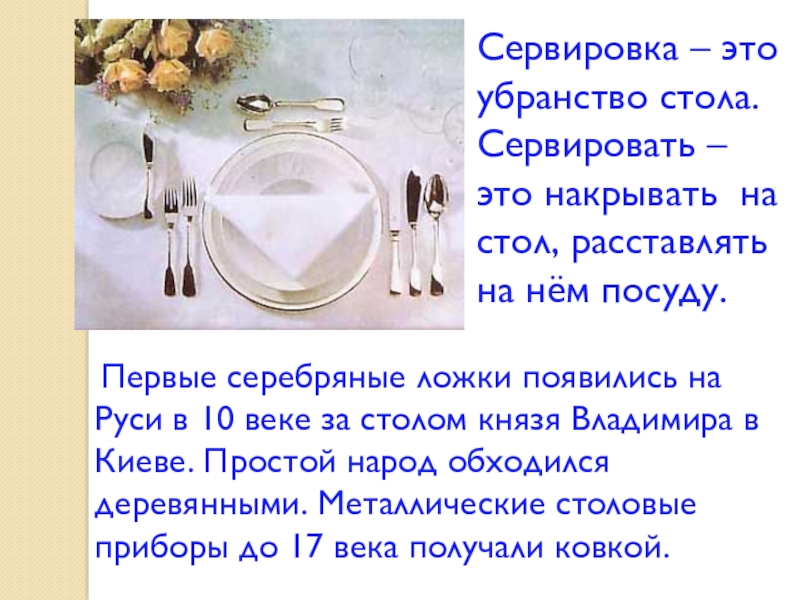 Первые серебряные ложки появились на Руси в 10 веке за столом князя Владимира в Киеве. Простой народ обходился деревянными. Металлические столовые приборы до 17 века получали ковкой.