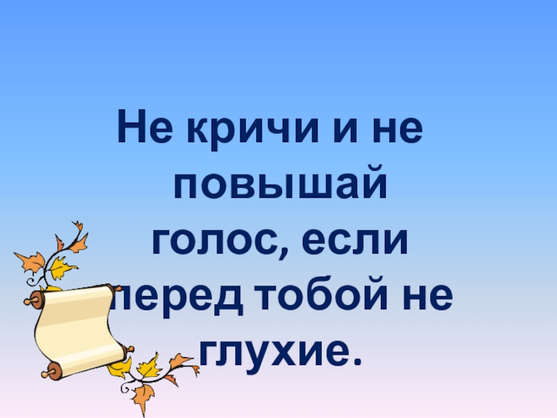 Слайд 17Не кричи и не повышай голос, если перед тобой не глухие.