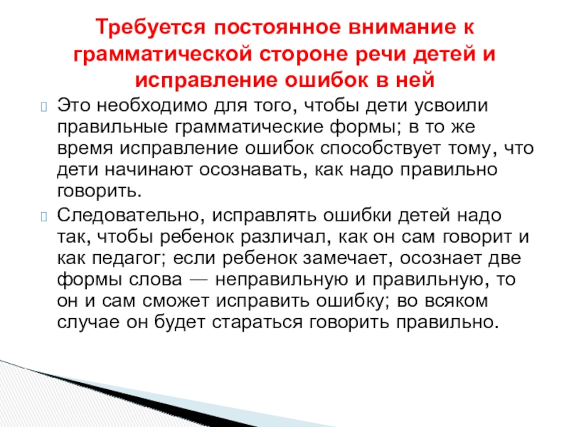 Требуется постоянное внимание к грамматической стороне речи детей и исправление ошибок в ней