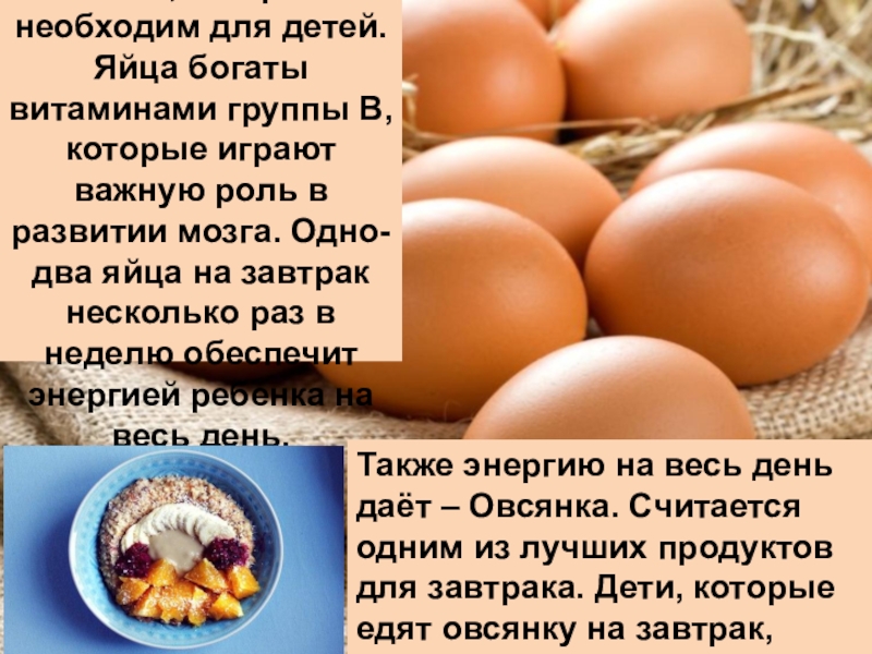 Также энергию на весь день даёт – Овсянка. Считается одним из лучших продуктов для завтрака. Дети, которые едят овсянку на завтрак, имеют лучшую концентрацию внимания в школе.