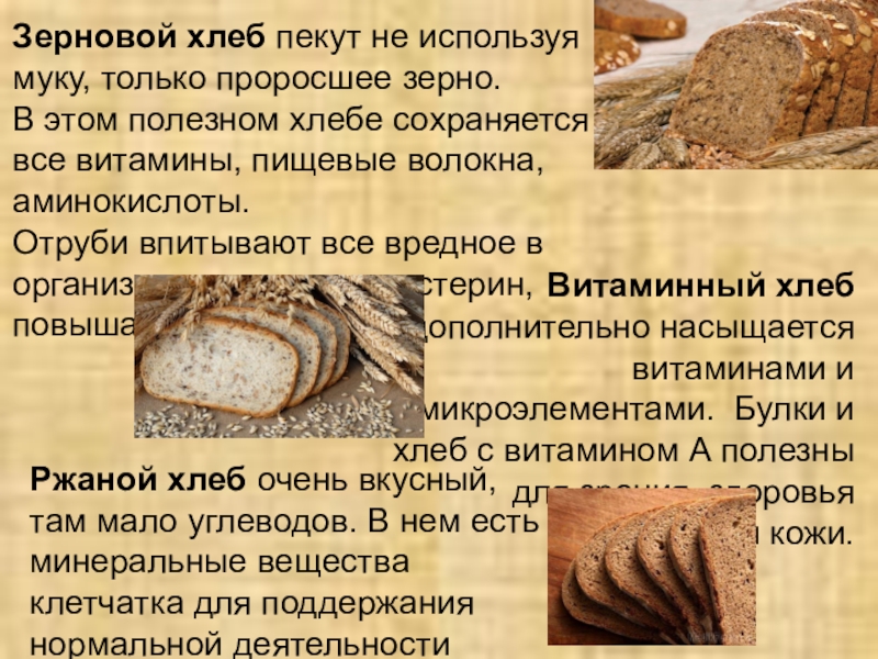 Витаминный хлеб дополнительно насыщается витаминами и микроэлементами. Булки и хлеб с витамином А полезны для зрения, здоровья молодости кожи.