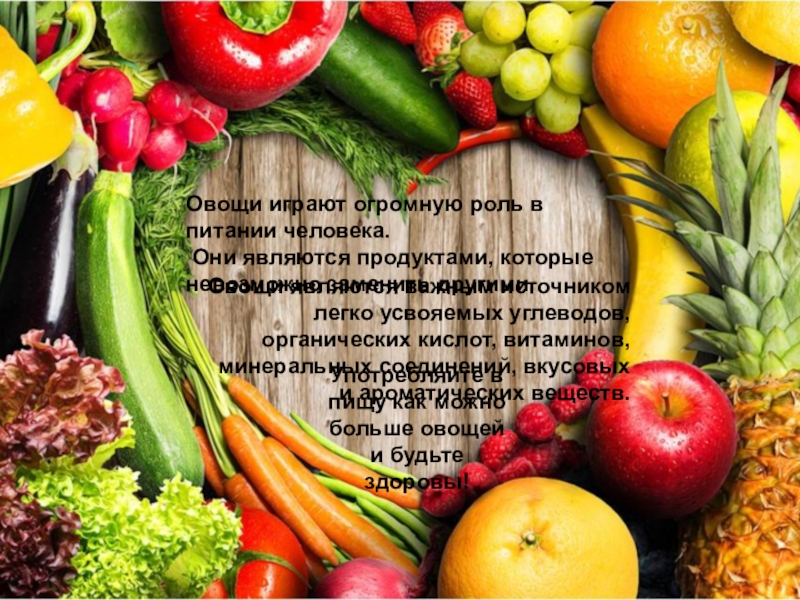 Овощи являются важным источником легко усвояемых углеводов, органических кислот, витаминов, минеральных соединений, вкусовых и ароматических веществ.