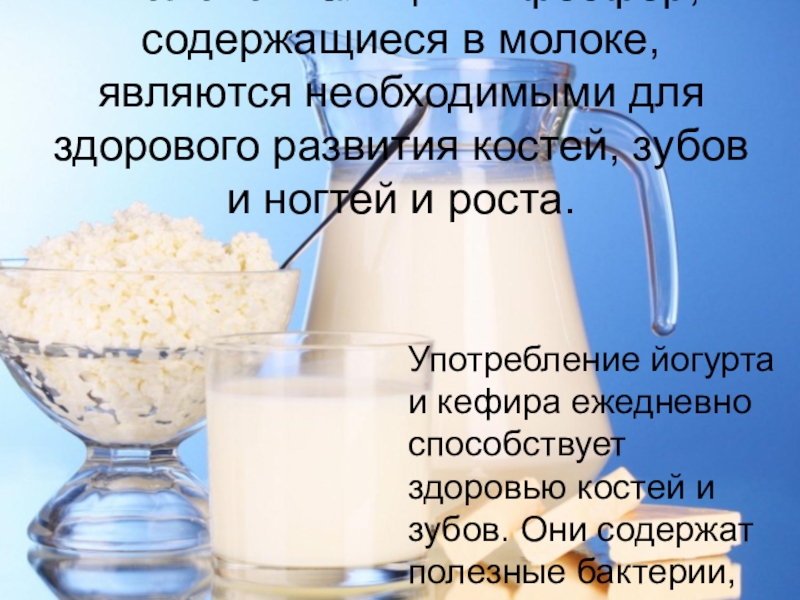 Употребление йогурта и кефира ежедневно способствует здоровью костей и зубов. Они содержат полезные бактерии, которые повышают иммунитет и способствуют пищеварению.