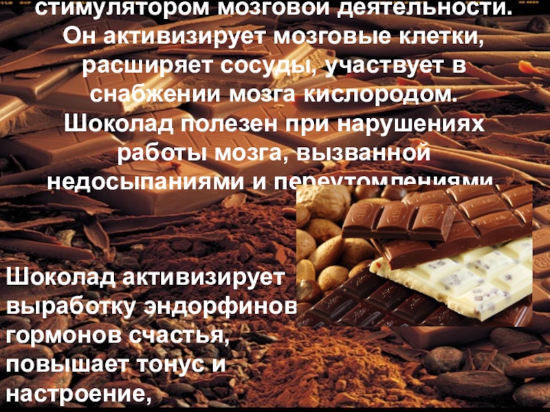 Шоколад активизирует выработку эндорфинов, гормонов счастья, повышает тонус и настроение, работоспособность и способность к концентрации внимания.