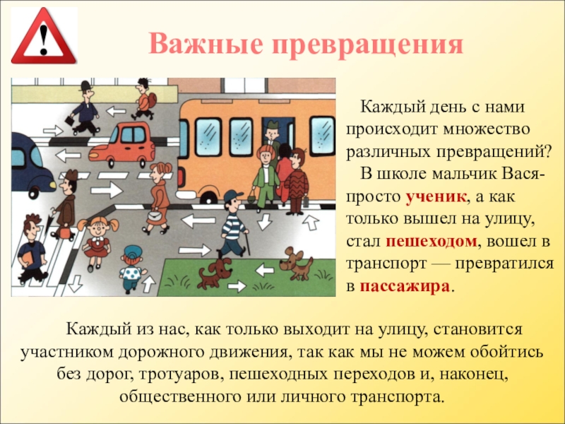 В школе мальчик Вася- просто ученик, а как только вышел на улицу, стал пешеходом, вошел в транспорт — превратился в пассажира.
