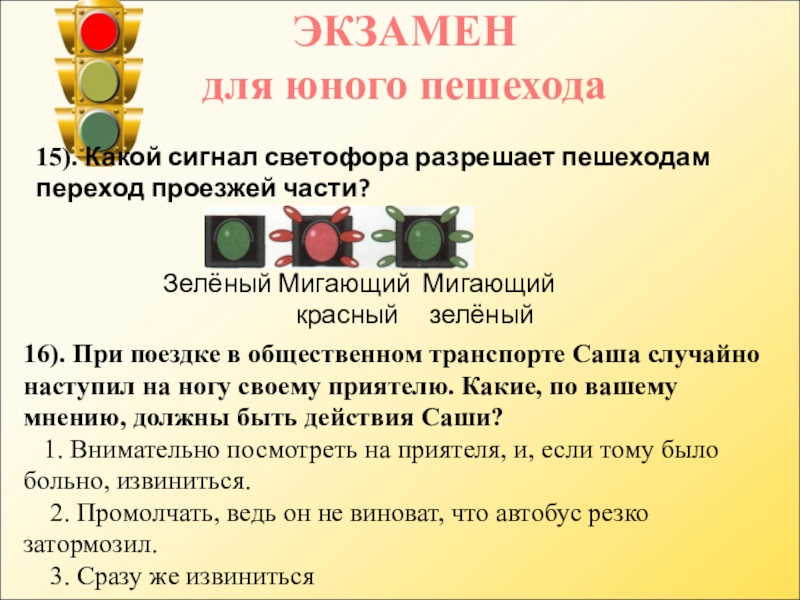 16). При поездке в общественном транспорте Саша случайно наступил на ногу своему приятелю. Какие, по вашему мнению, должны быть действия Саши?