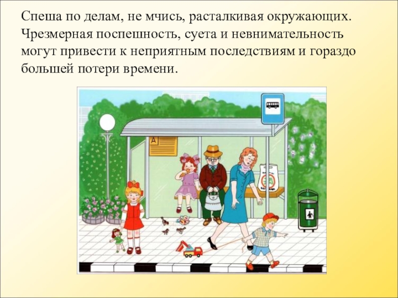 Человек, который думает о других, в транспорте всегда снимет с плеч большой рюкзак и возьмёт его в руки, чтобы не задеть и не запачкать окружающих, а если нечаянно кого-то толкнёт, то всегда извинится. Такой человек не станет в транспорте стряхивать снег или капли дождя с одежды, есть мороженое и сумками занимать места для пассажиров.