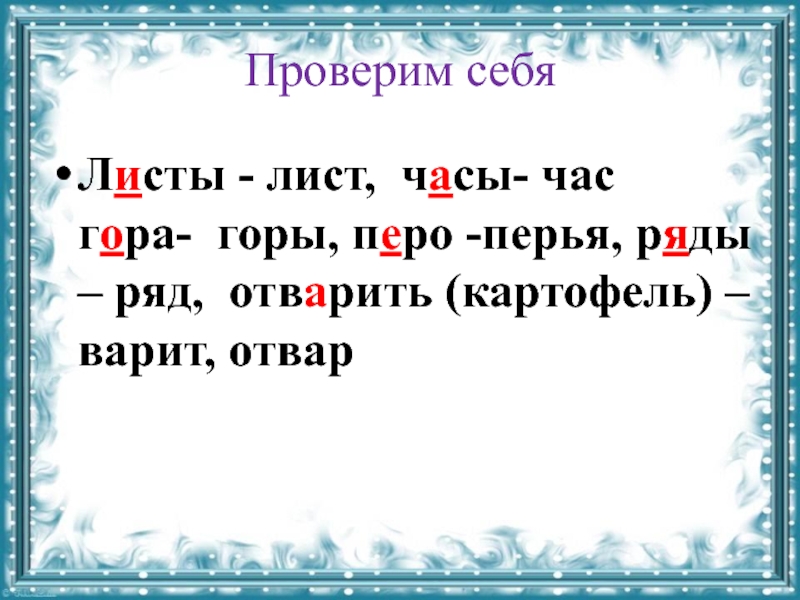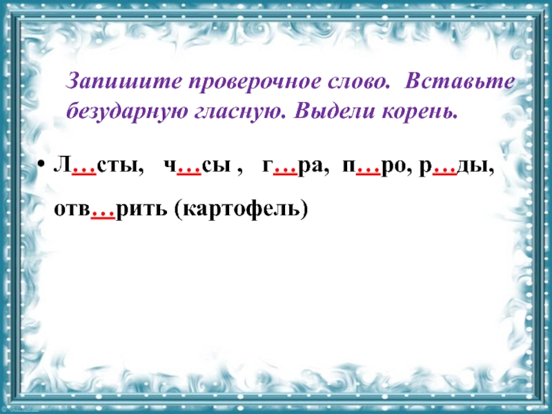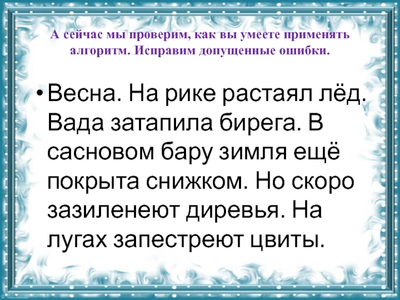 Весна. На рике растаял лёд. Вада затапила бирега. В сасновом бару зимля ещё покрыта снижком. Но скоро зазиленеют диревья. На лугах запестреют цвиты.
