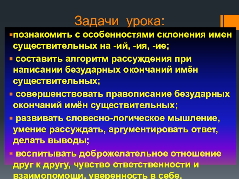 познакомить с особенностями склонения имен существительных на -ий, -ия, -ие;