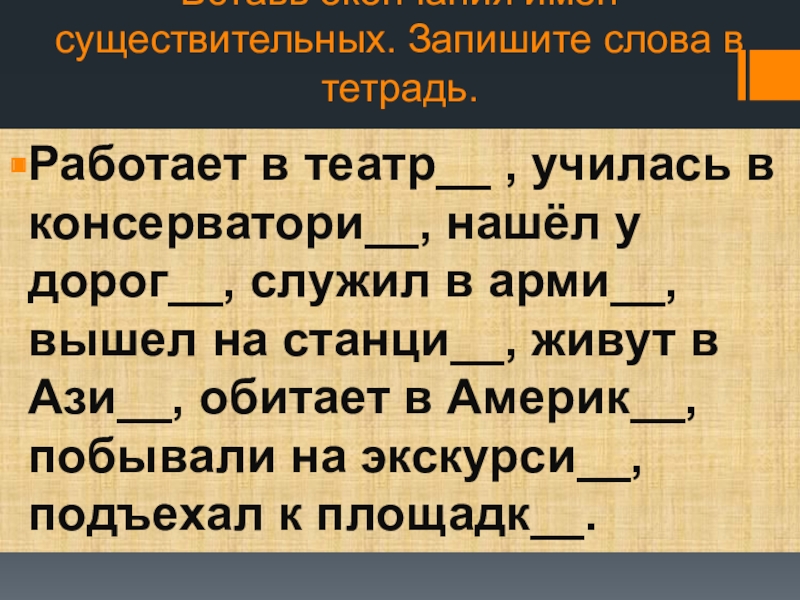 На картинк__ ( ), от деревн__ (), около двер__ ( ), на улиц__ ( ), у лошад__ ( ), учениц__й ( ), в лагер__ ( ), на площад__ ( ),