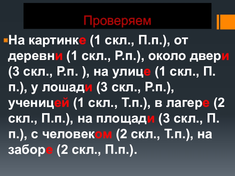 двери (3 скл., Р.п. ), на улице (1 скл., П.п.), у лошади (3 скл., Р.п.), ученицей (1 скл., Т.п.), в лагере (2 скл., П.п.), на площади (3 скл., П.п.), с человеком (2 скл., Т.п.), на заборе (2 скл., П.п.).