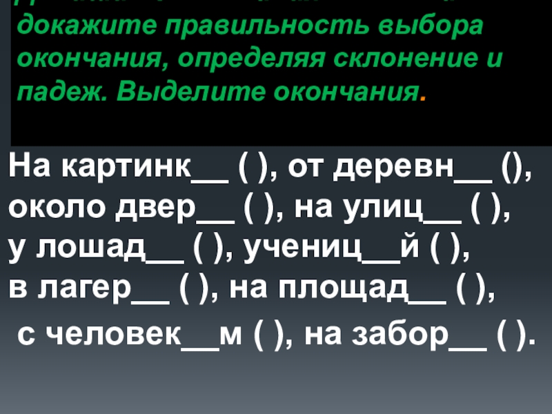 Слайд 5Допишите окончания. В скобках докажите правильность выбора окончания, определяя склонение и