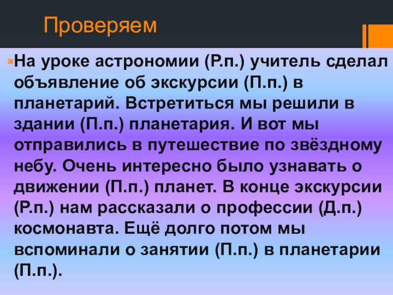 планетарий. Встретиться мы решили в здании (П.п.) планетария. И вот мы отправились в путешествие по звёздному небу. Очень интересно было узнавать о движении (П.п.) планет. В конце экскурсии (Р.п.) нам рассказали о профессии (Д.п.) космонавта. Ещё долго потом мы вспоминали о занятии (П.п.) в планетарии (П.п.).