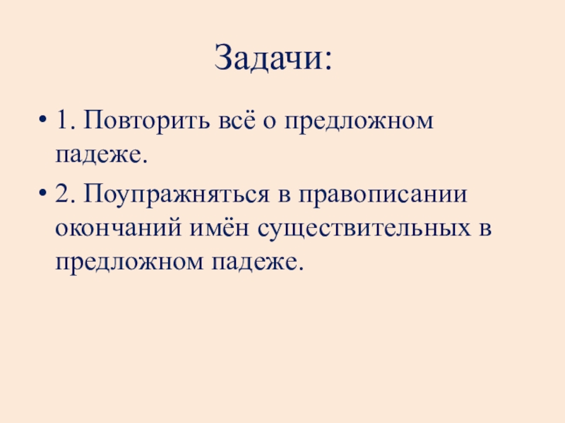 Задачи:1. Повторить всё о предложном падеже.2. Поупражняться в правописании окончаний имён существительных в предложном падеже.