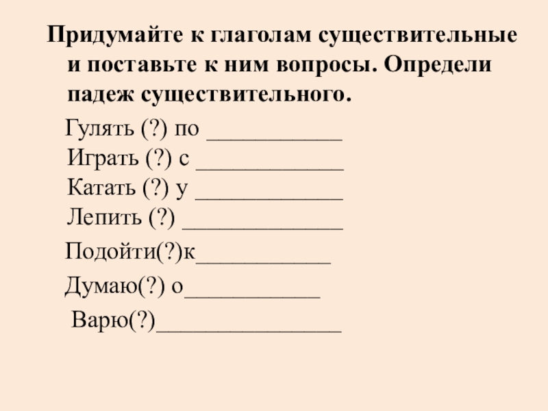 Придумайте к глаголам существительные и поставьте к ним вопросы. Определи падеж существительного.  Гулять (?) по ___________