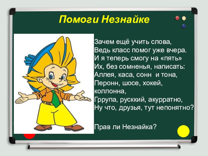 Помоги НезнайкеЗачем ещё учить слова,     Ведь класс помог уже вчера.