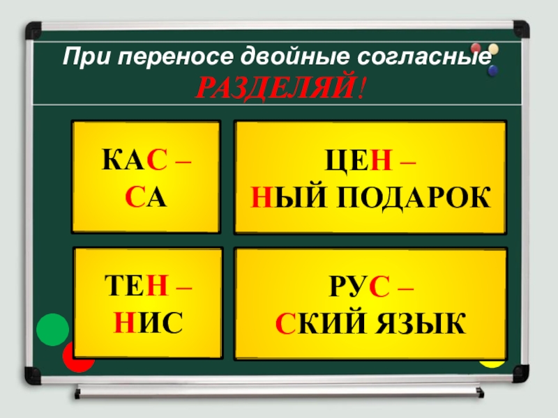 При переносе двойные согласные РАЗДЕЛЯЙ!КАС –САТЕН –НИСЦЕН –НЫЙ ПОДАРОКРУС –СКИЙ ЯЗЫК