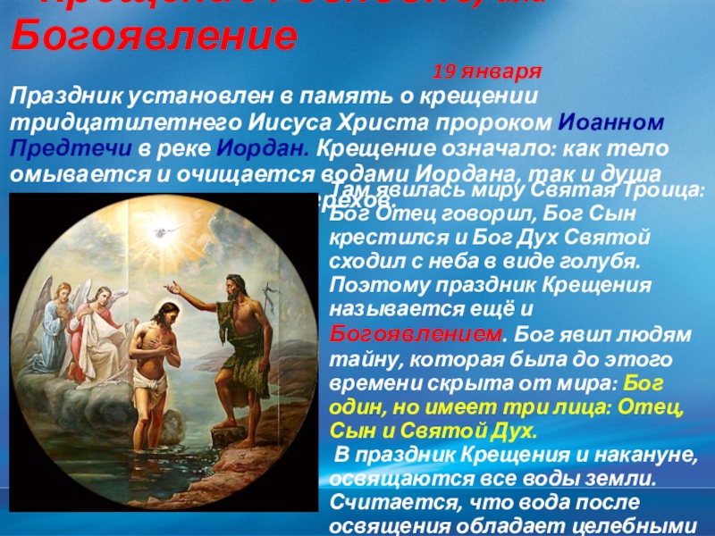 Праздник установлен в память о крещении тридцатилетнего Иисуса Христа пророком Иоанном Предтечи в реке Иордан. Крещение означало: как тело омывается и очищается водами Иордана, так и душа человека очищается от грехов.