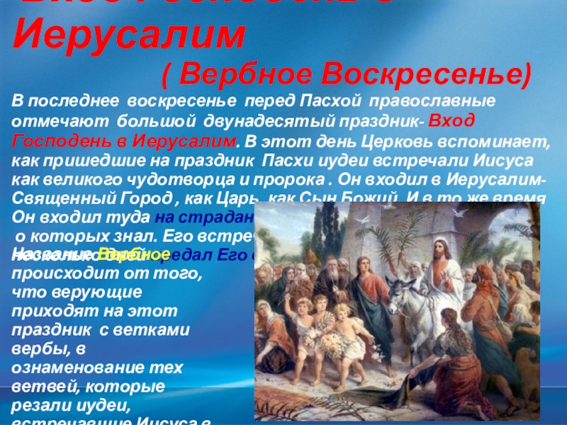 В последнее воскресенье перед Пасхой православные отмечают большой двунадесятый праздник- Вход Господень в Иерусалим. В этот день Церковь вспоминает, как пришедшие на праздник Пасхи иудеи встречали Иисуса как великого чудотворца и пророка . Он входил в Иерусалим- Священный Город , как Царь, как Сын Божий. И в то же время Он входил туда на страдания и на муки,