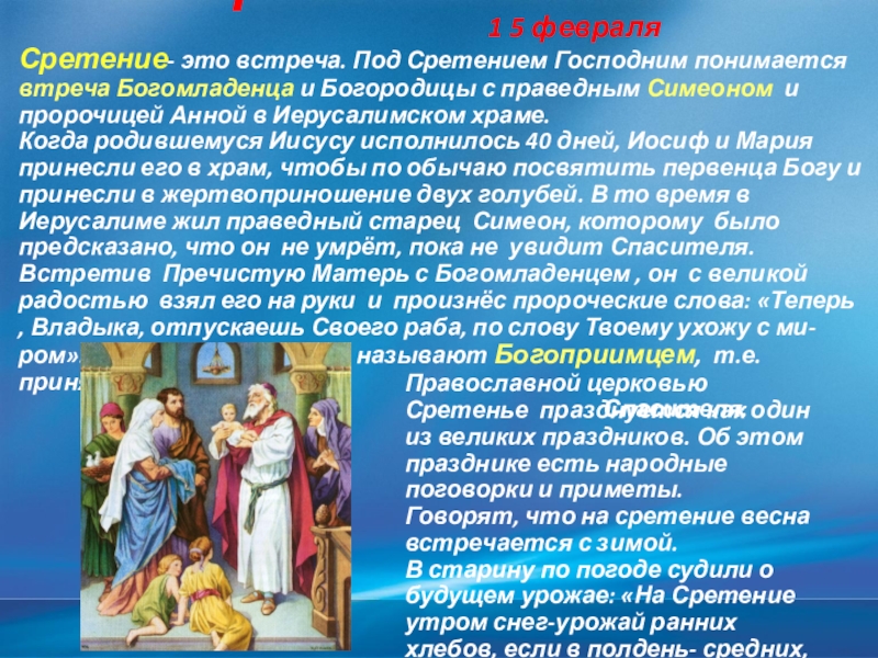Когда родившемуся Иисусу исполнилось 40 дней, Иосиф и Мария принесли его в храм, чтобы по обычаю посвятить первенца Богу и принесли в жертвоприношение двух голубей. В то время в Иерусалиме жил праведный старец Симеон, которому было предсказано, что он не умрёт, пока не увидит Спасителя. Встретив Пречистую Матерь с Богомладенцем , он с великой радостью взял его на руки и произнёс пророческие слова: «Теперь , Владыка, отпускаешь Своего раба, по слову Твоему ухожу с ми- ром». Праведного Симеона называют Богоприимцем, т.е. принявшим на свои руки