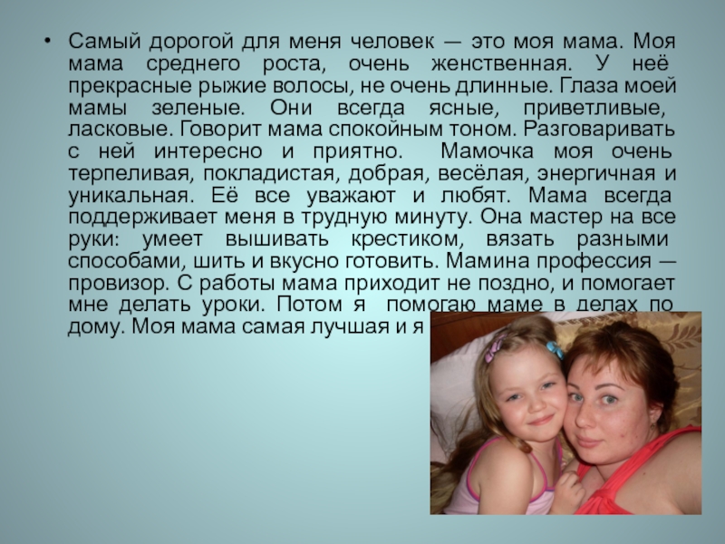 среднего роста, очень женственная. У неё прекрасные рыжие волосы, не очень длинные. Глаза моей мамы зеленые. Они всегда ясные, приветливые, ласковые. Говорит мама спокойным тоном. Разговаривать с ней интересно и приятно. Мамочка моя очень терпеливая, покладистая, добрая, весёлая, энергичная и уникальная. Её все уважают и любят. Мама всегда поддерживает меня в трудную минуту. Она мастер на все руки: умеет вышивать крестиком, вязать разными способами, шить и вкусно готовить. Мамина профессия — провизор. С работы мама приходит не поздно, и помогает мне делать уроки. Потом я помогаю маме в делах по дому. Моя мама самая лучшая и я её очень-очень люблю!