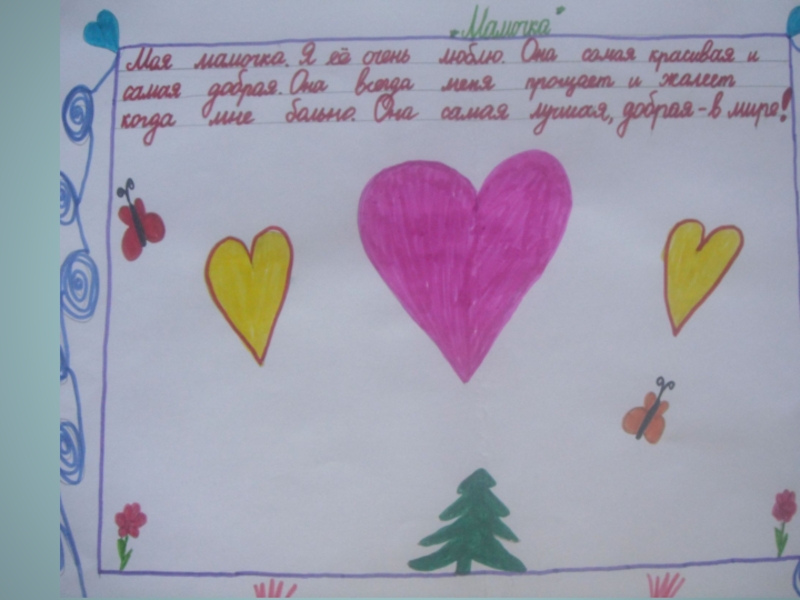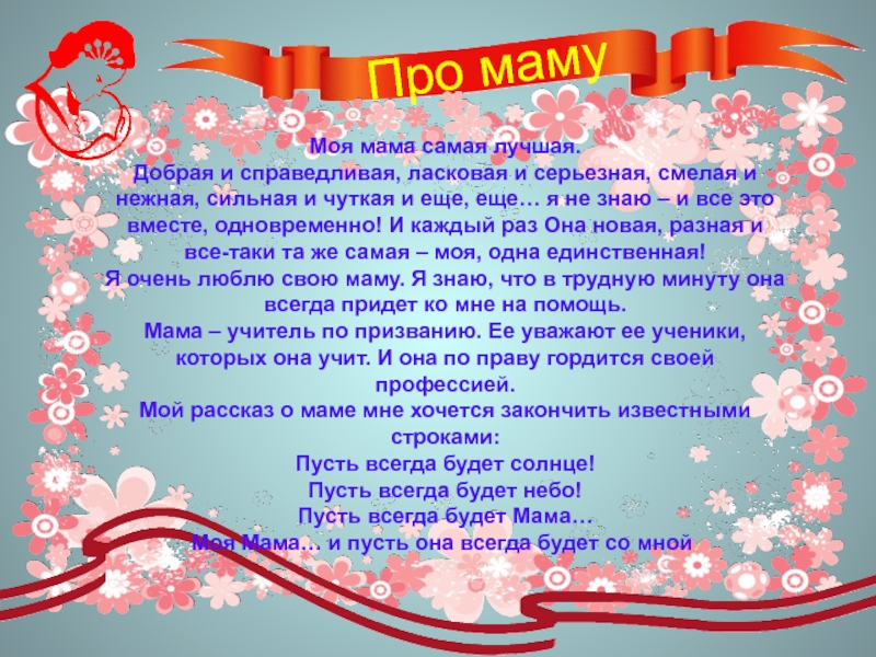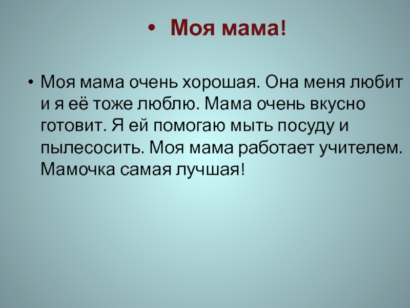 и я её тоже люблю. Мама очень вкусно готовит. Я ей помогаю мыть посуду и пылесосить. Моя мама работает учителем. Мамочка самая лучшая!