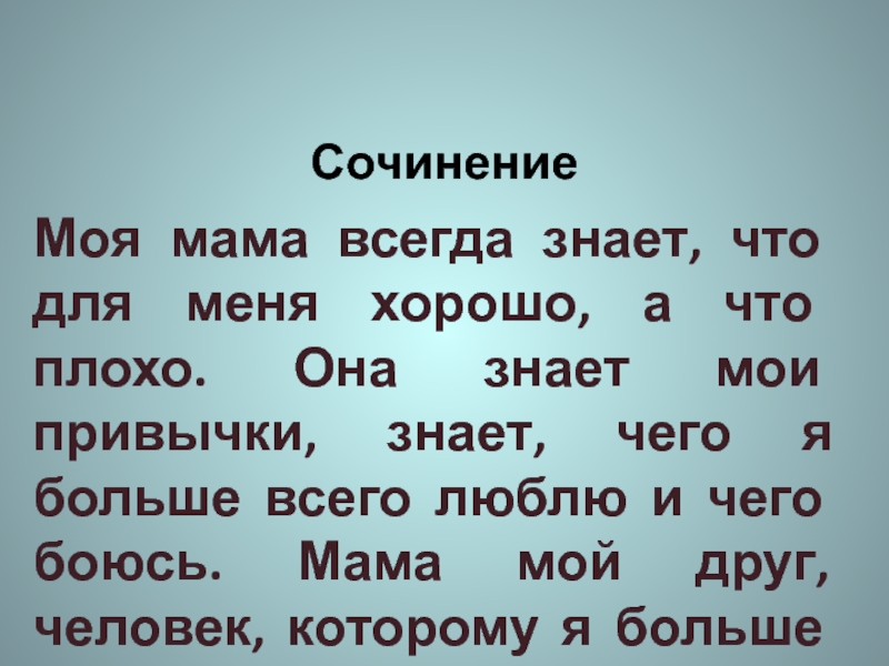 Она знает мои привычки, знает, чего я больше всего люблю и чего боюсь. Мама мой друг, человек, которому я больше всего доверяю и люблю.
