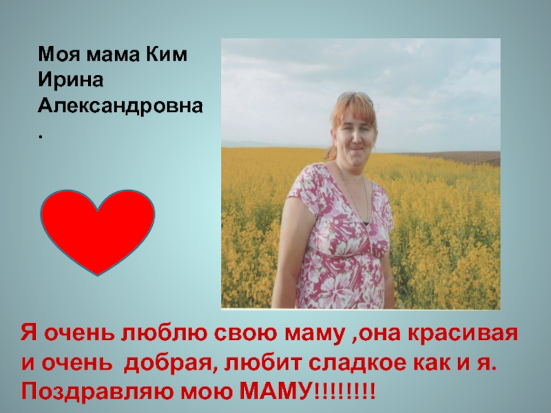 красивая и очень добрая, любит сладкое как и я. Поздравляю мою МАМУ!!!!!!!!