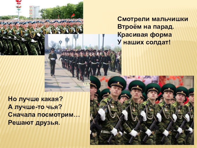 Но лучше какая?А лучше-то чья?Сначала посмотрим…Решают друзья.Смотрели мальчишкиВтроём на парад.Красивая форма У наших солдат!