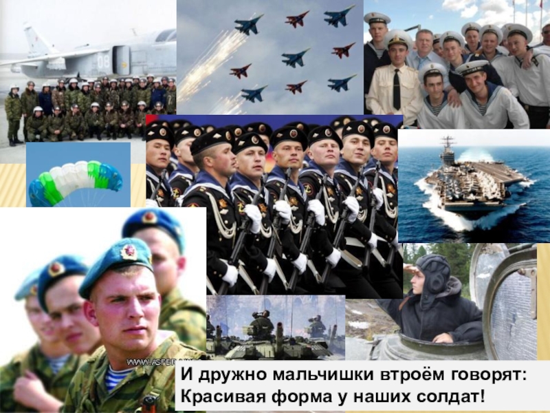 И дружно мальчишки втроём говорят:Красивая форма у наших солдат!