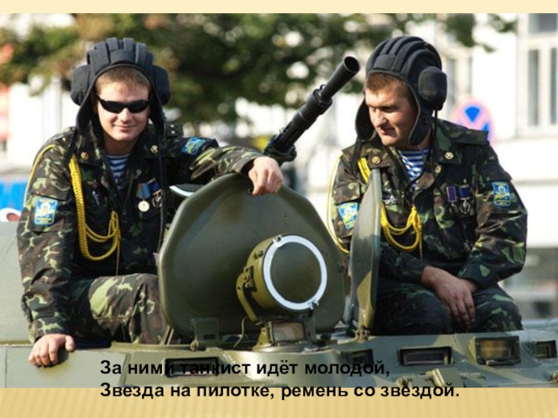 Слайд 11За ними танкист идёт молодой,