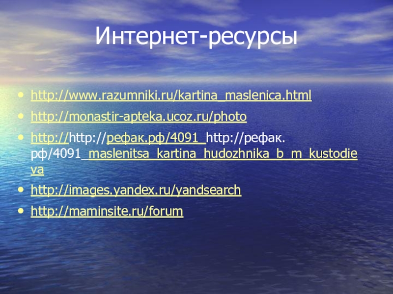Интернет-ресурсыhttp://www.razumniki.ru/kartina_maslenica.htmlhttp://monastir-apteka.ucoz.ru/photohttp://http://рефак.рф/4091_http://рефак.рф/4091_maslenitsa_kartina_hudozhnika_b_m_kustodievahttp://images.yandex.ru/yandsearchhttp://maminsite.ru/forum