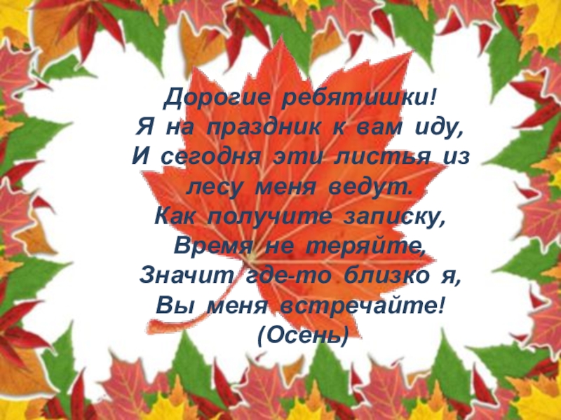Дорогие  ребятишки!Я  на  праздник  к  вам  иду,И  сегодня  эти  листья  из  лесу  меня  ведут.Как  получите  записку,Время  не