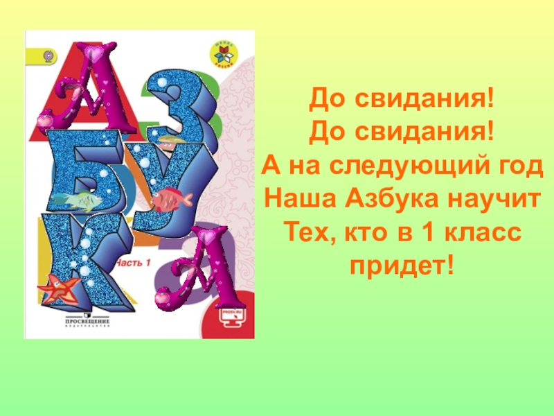 До свидания! До свидания!А на следующий годНаша Азбука научитТех, кто в 1 класс придет!