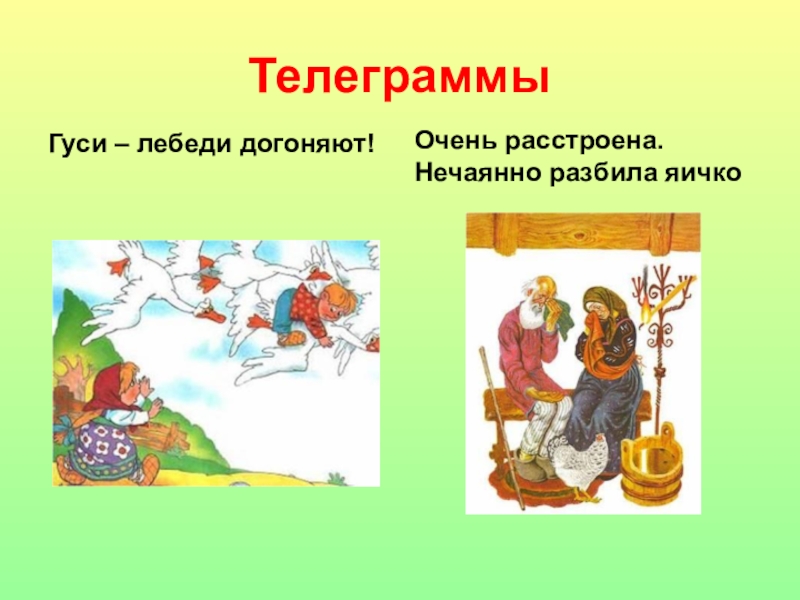 ТелеграммыГуси – лебеди догоняют! Очень расстроена. Нечаянно разбила яичко