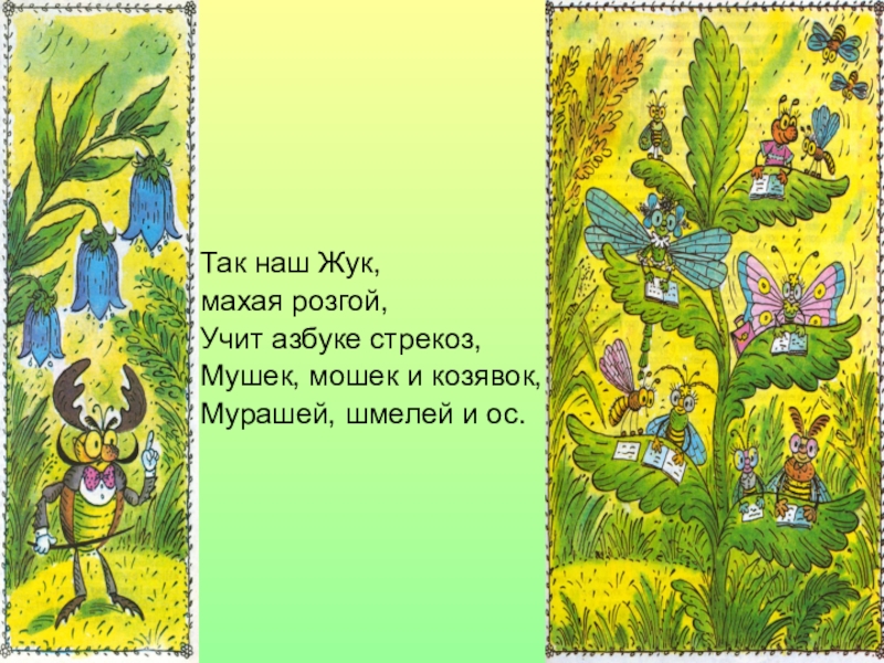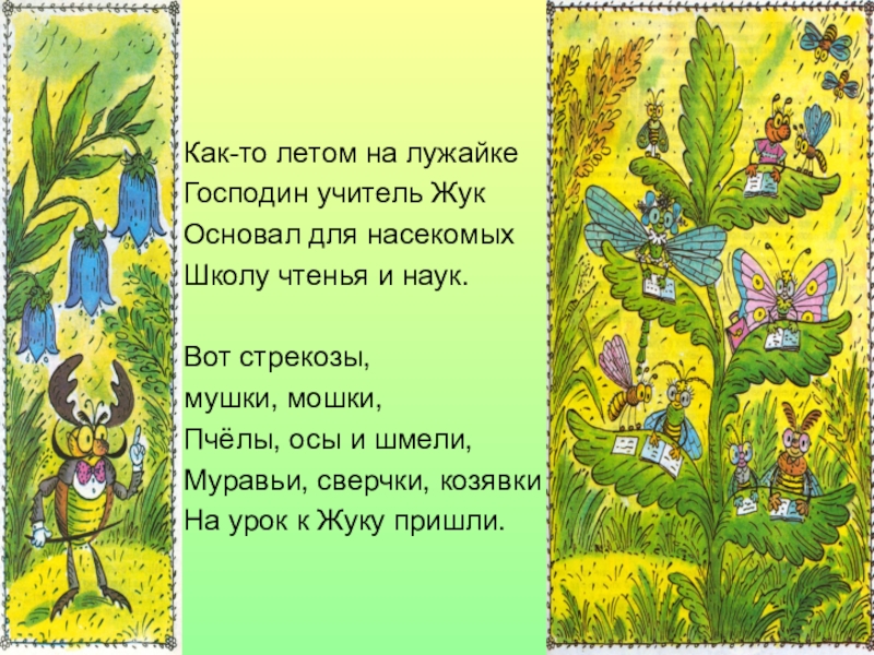 Как-то летом на лужайке Господин учитель Жук Основал для насекомых Школу чтенья и наук.Вот стрекозы, мушки, мошки,