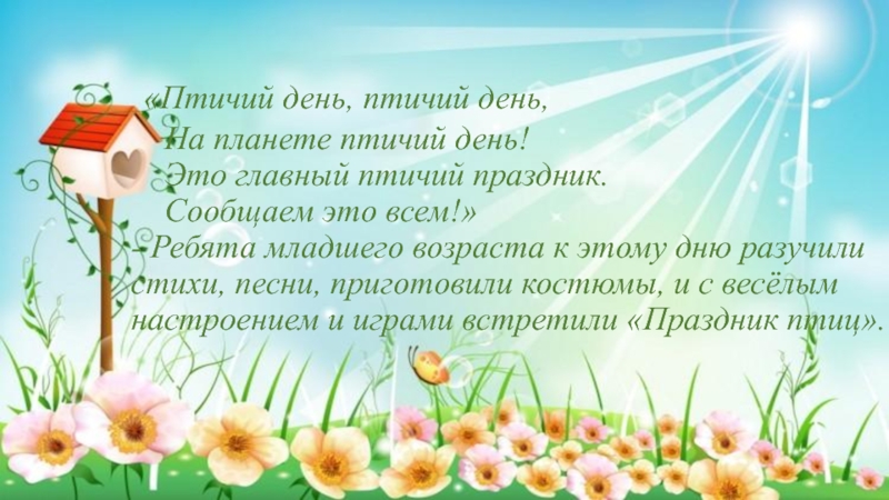 «Птичий день, птичий день,   На планете птичий день!   Это главный птичий праздник.