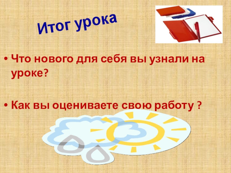 Итог урокаЧто нового для себя вы узнали на уроке?Как вы оцениваете свою работу ?