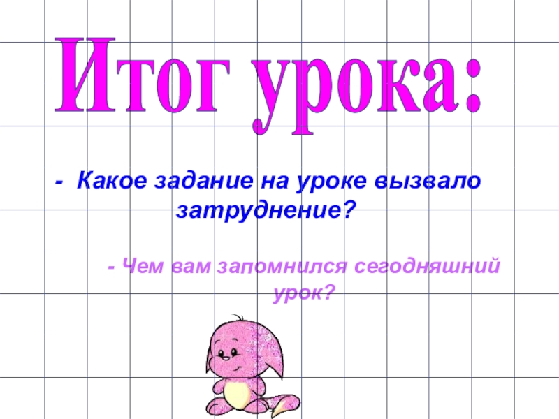 Итог урока: - Какое задание на уроке вызвало затруднение?- Чем вам запомнился сегодняшний урок?