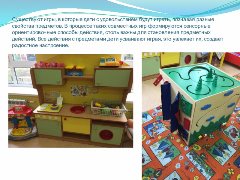 свойства предметов. В процессе таких совместных игр формируются сенсорные ориентировочные способы действия, столь важны для становления предметных действий. Все действия с предметами дети усваивают играя, это увлекает их, создаёт радостное настроение.