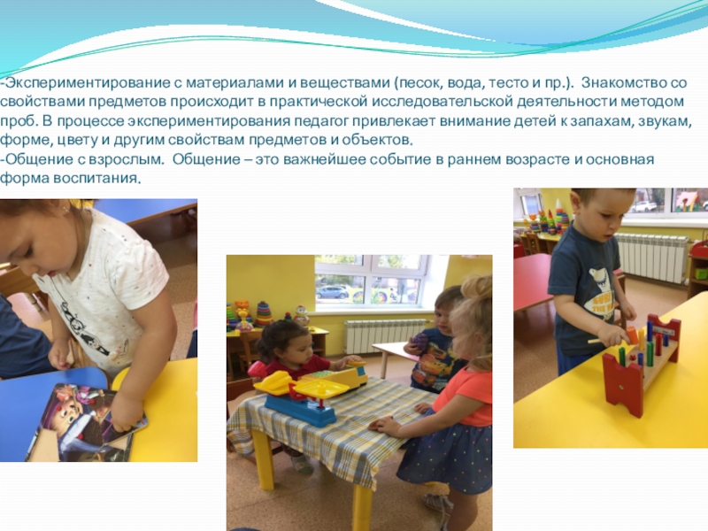 Слайд 5-Экспериментирование с материалами и веществами (песок, вода, тесто и пр.). Знакомство
