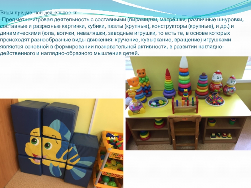 и разрезные картинки, кубики, пазлы (крупные), конструкторы (крупные), и др.) и динамическими (юла, волчки, неваляшки, заводные игрушки, то есть те, в основе которых происходят разнообразные виды движения: кручение, кувыркание, вращение) игрушками является основной в формировании познавательной активности, в развитии наглядно-действенного и наглядно-образного мышления детей.