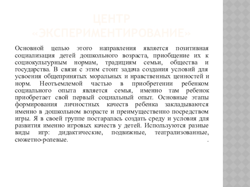 их к социокультурным нормам, традициям семьи, общества и государства. В связи с этим стоит задача создания условий для усвоения общепринятых моральных и нравственных ценностей и норм. Неотъемлемой частью в приобретении ребенком социального опыта является семья, именно там ребенок приобретает свой первый социальный опыт. Основные этапы формирования личностных качеств ребенка закладываются именно в дошкольном возрасте и преимущественно посредством игры. Я в своей группе постаралась создать среду и условия для развития именно игровых качеств у детей. Используются разные виды игр: дидактические, подвижные, театрализованные, сюжетно-ролевые. .